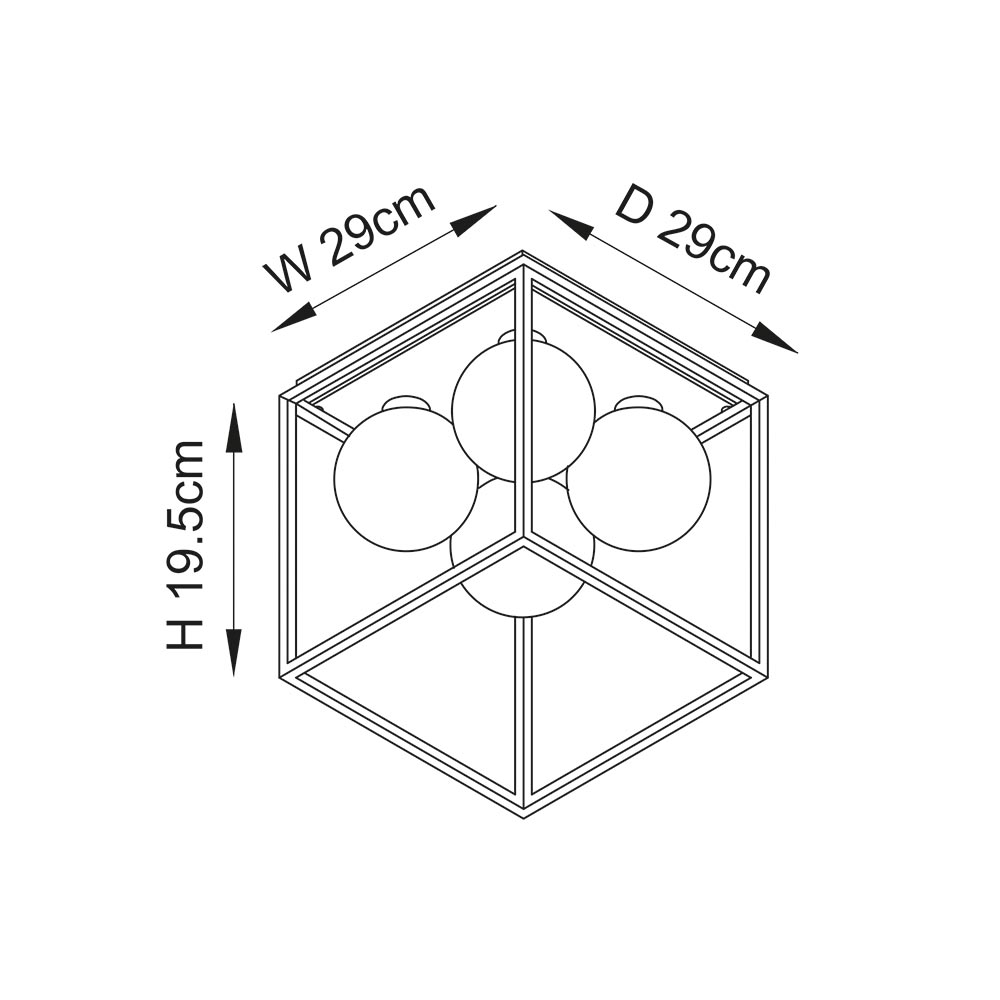 Industrial style IP44 rated framed ceiling light. Four opal glass orbs are encased in a black square frame to create a bold lighting feature. The ideal finishing touch for bathrooms with on-trend Crittall-style showers and matt black brassware.