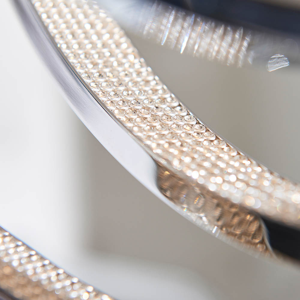 Stylish chrome plated semi flush light encrusted with thousands of clear faceted reflective detail. This captivating light fitting with adjustable hoop positions will add a contemporary edge to any bathroom and is IP44 rated. Other family items also available to complete the look.