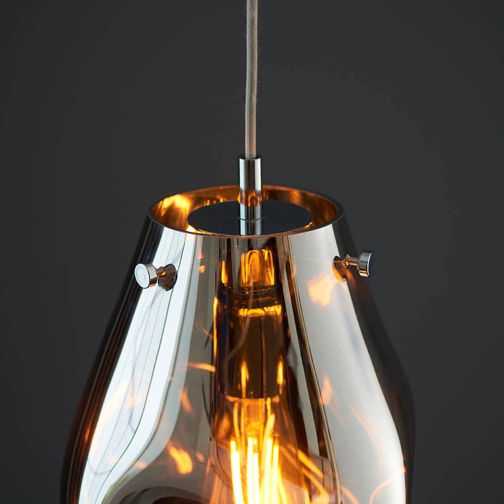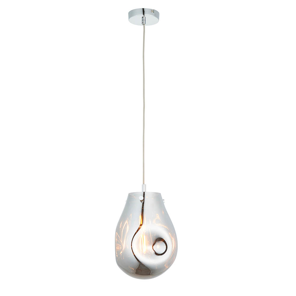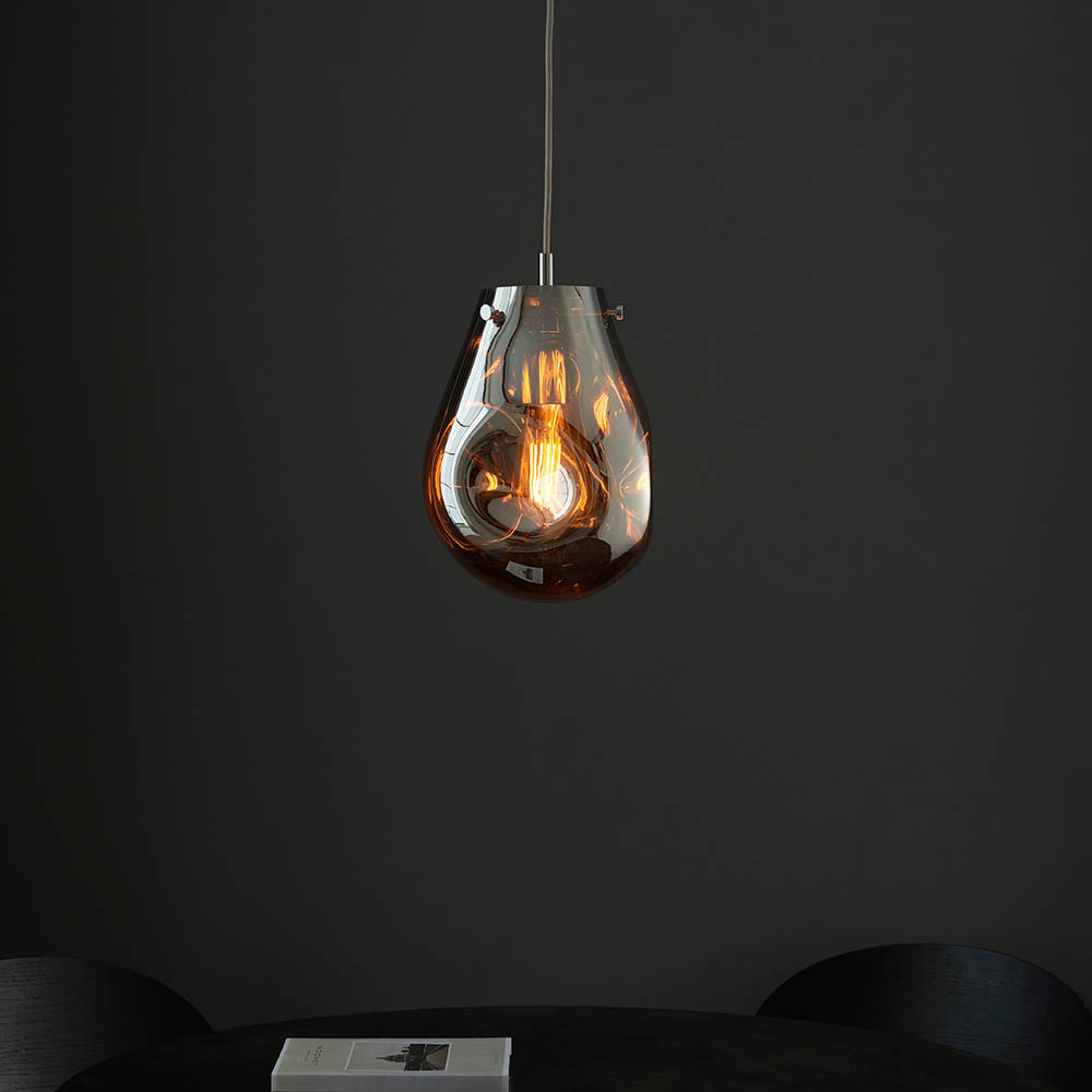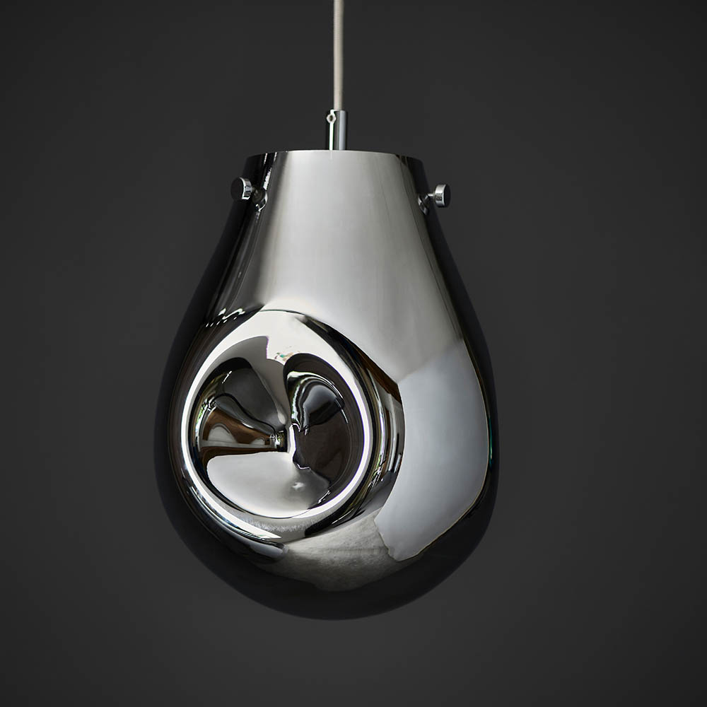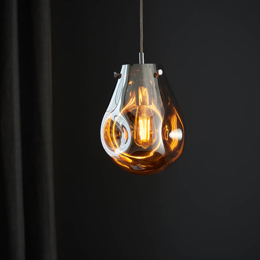 Elevate your interior with our stunning, chrome coloured molten glass pendant with chrome plated metalwork. Featuring a range of coloured metallic glass, this simple design has a pleasing fluidity thanks to its organic appearance. Combine with matching items in this range for a bold and cohesive look.