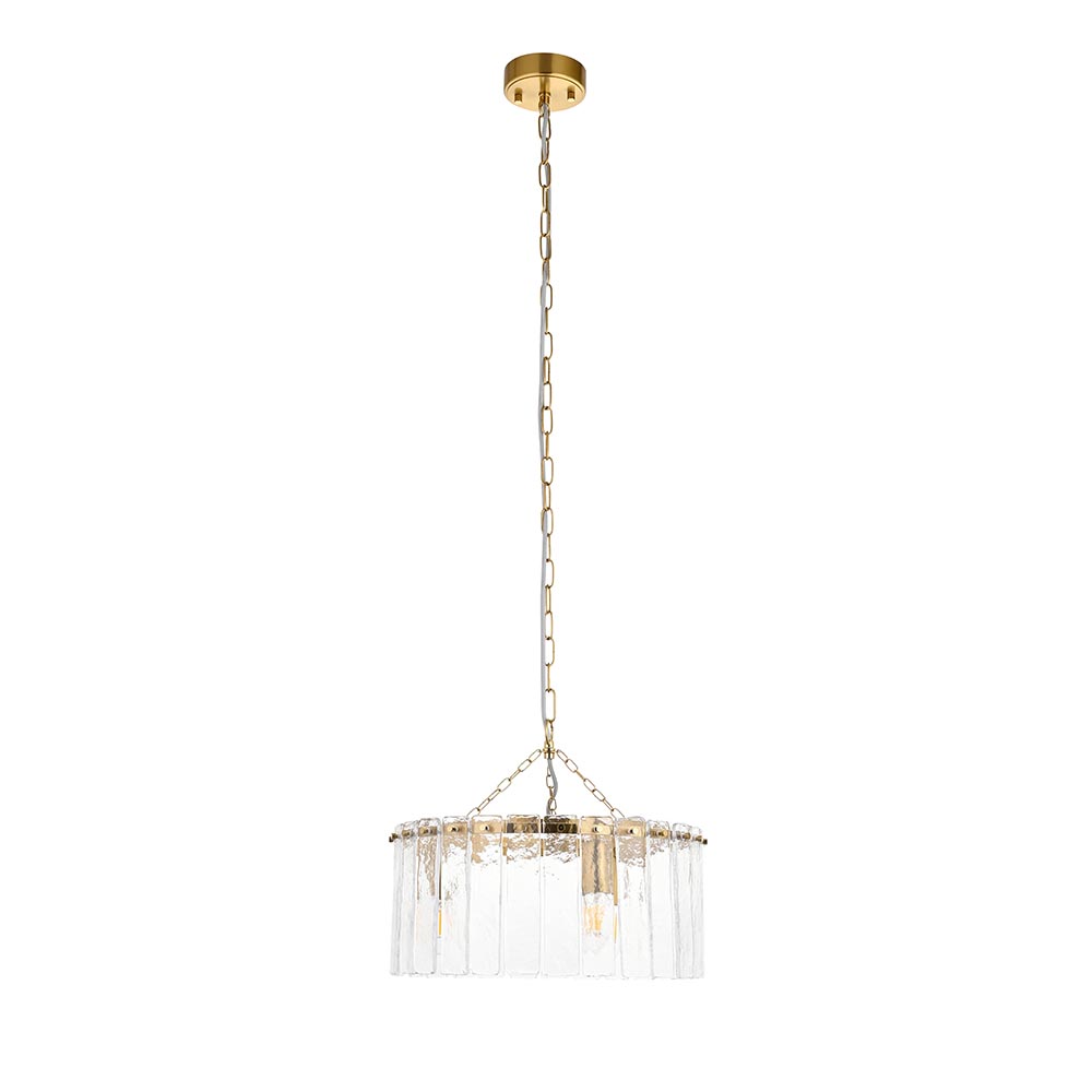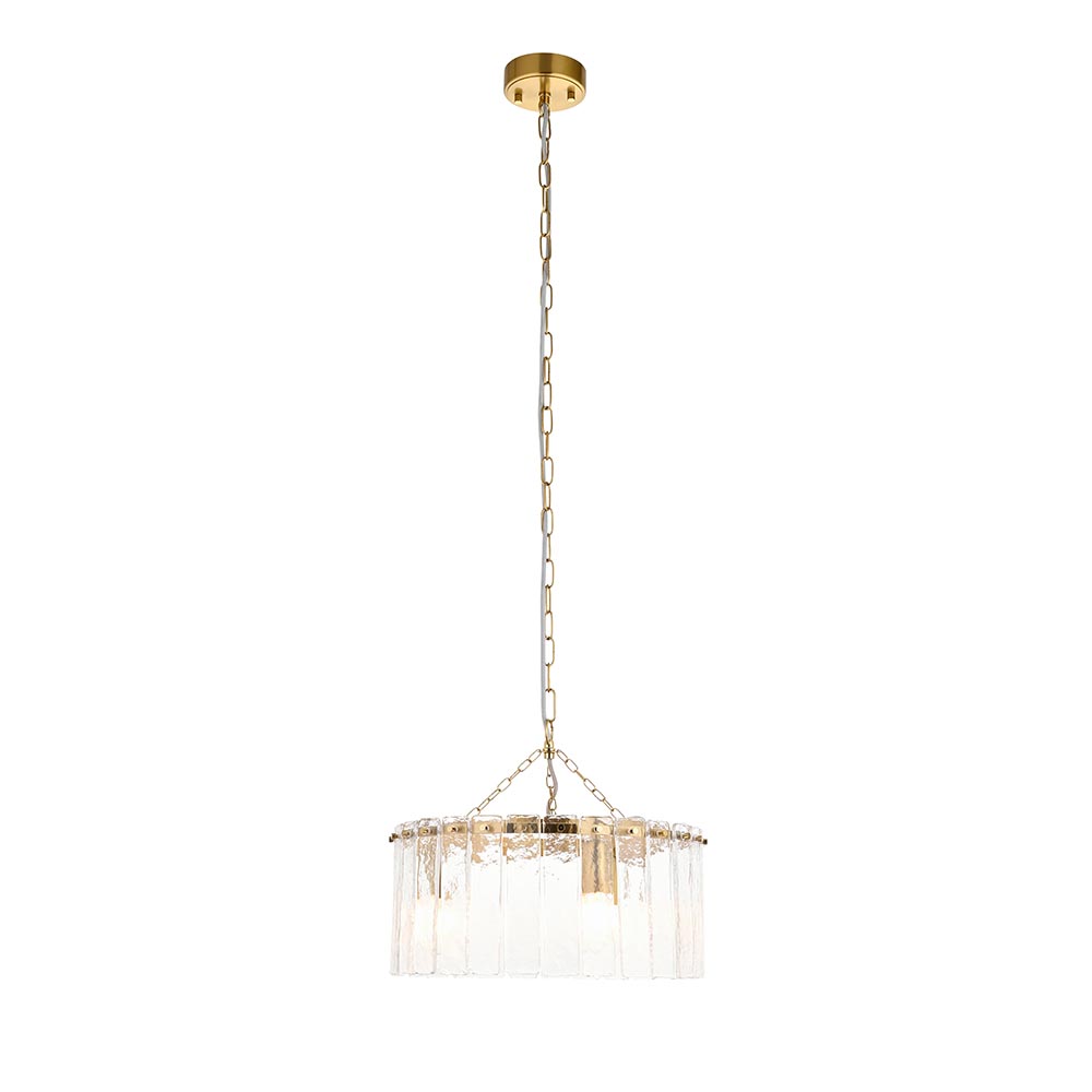 Inspired by vintage Venetian art lighting this elegant and artistic 3-light pendant features a circular arrangement of clear handmade textured glass that catch and refract light with captivating depth. Framed by a warm brass band and suspended from a height-adjustable chain with grey braided fabric flex, it offers both visual impact and soft, ambient glow. Ideal for dining rooms, hallways, or living areas, this pendant combines craftsmanship and sophistication in a timeless silhouette.
