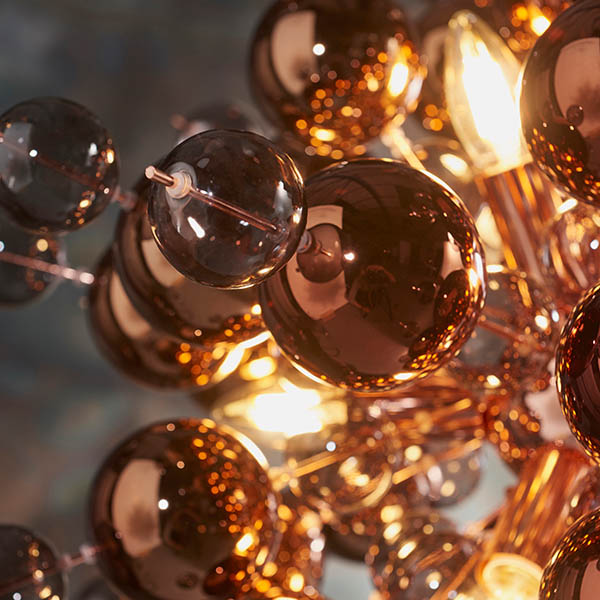 Make a dramatic statement with this spectacular, mirror bomb light fitting embellished with glossy smoked glass and metallic plated balls. This stunning, nine-light pendant features an explosion of shiny glass spheres, creating an atmospheric glow and striking shadow patterns.