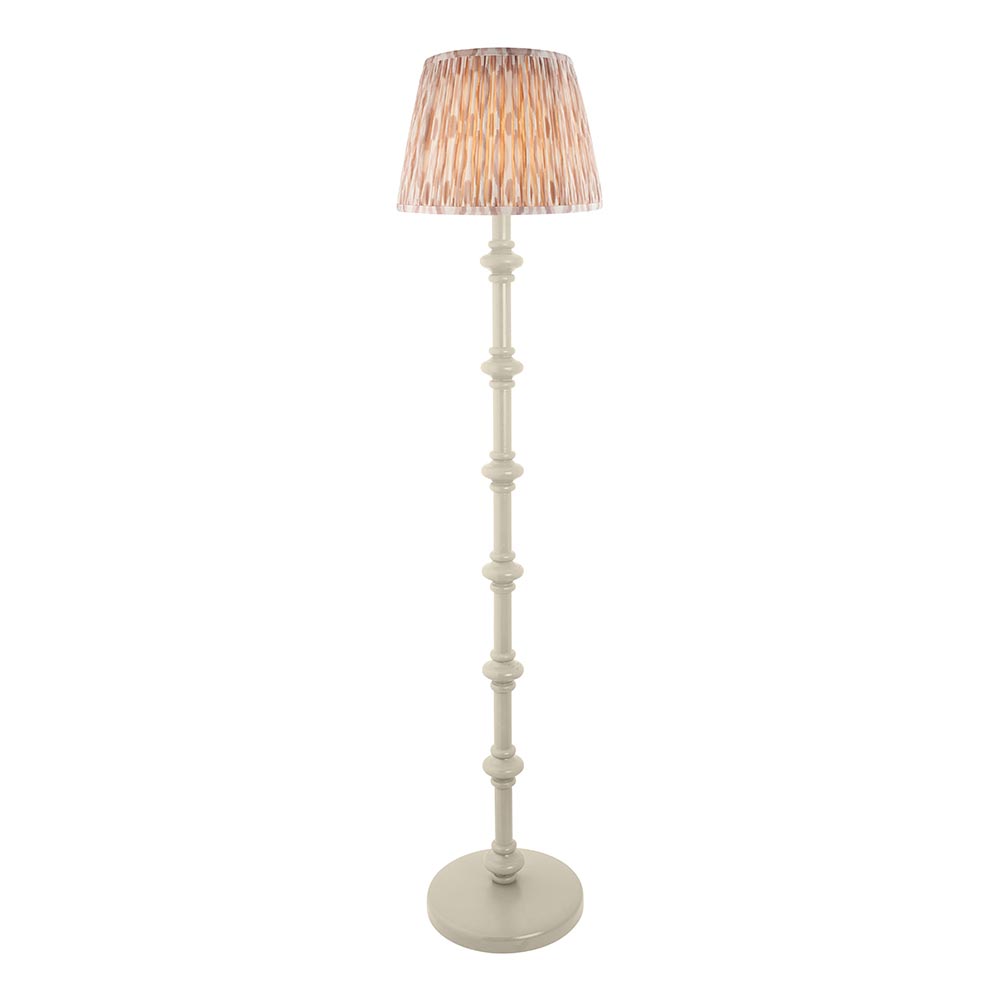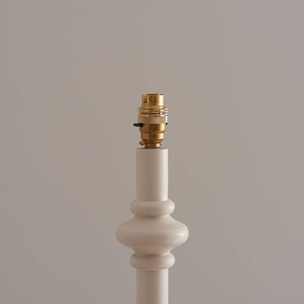 This unique wooden turned spindle floor light is inspired by past design styles with a fresh update. Painted in classic satin almond white, with a brass B22 switched lamp holder and grey braided fabric flex. Each product is turned on a wood lathe by hand and will be unique; any variants in finish are part of the individual charm of the product. This floor light is finished with our natural 35cm Ikat shade for a unique, classic style.