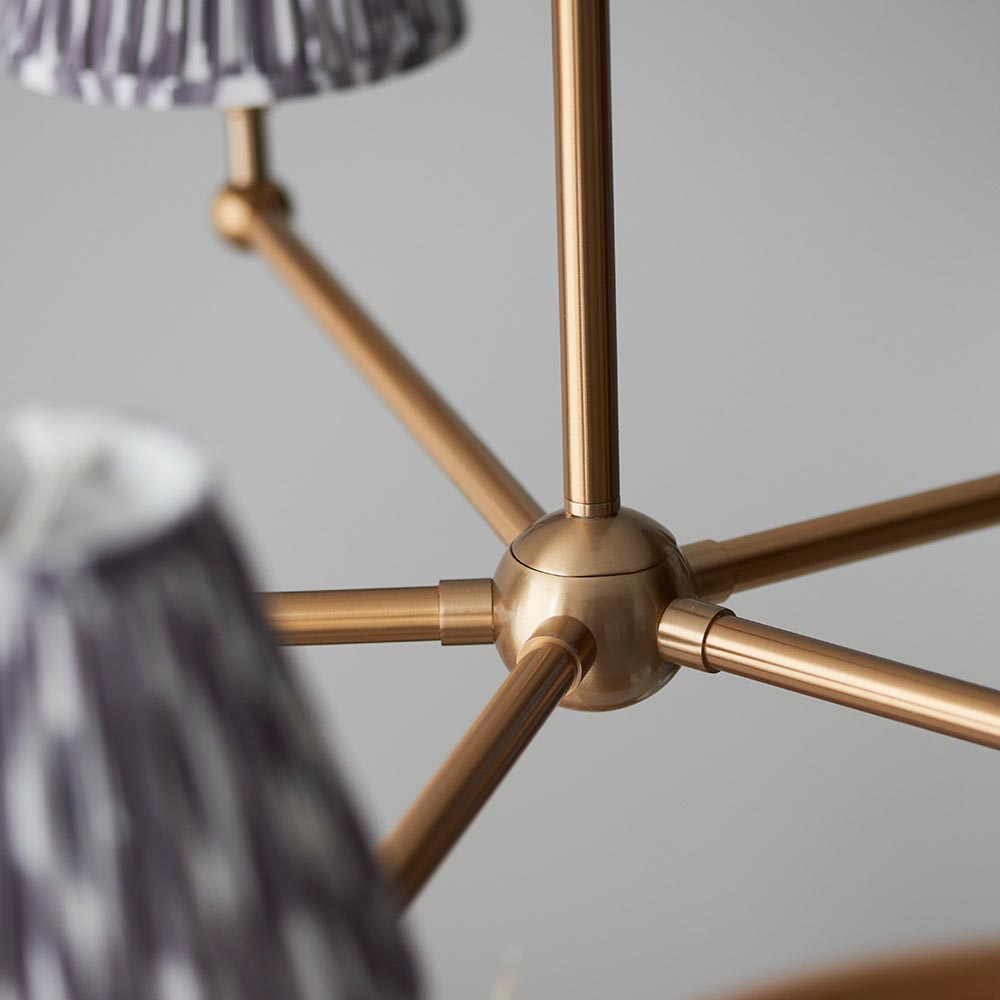 An elegant 5 light classic pendant featuring B22 lamp holders for an authentic feel. Finished in brushed aged brass, suspended from height adjustable 1.5m chain with grey braided fabric flex. Finished with our stylish pearl grey 16cm Ikat shades to complete the look.
