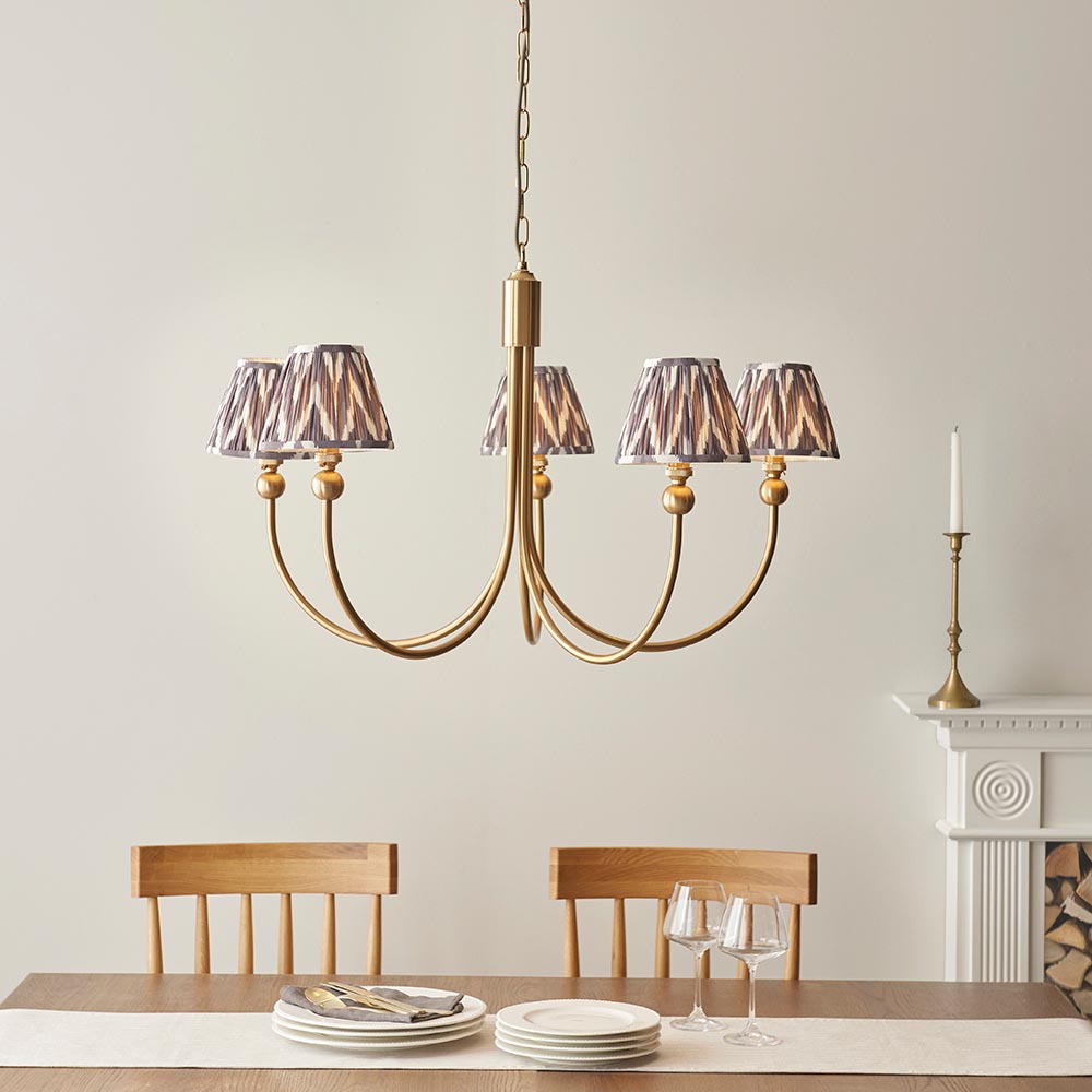 Inspired by classic designs from the past with a fresh new makeover. An elegant 5 light curved arm classic pendant, finished in brushed aged brass, suspended from height adjustable 1.5m chain with grey braided fabric flex and featuring B22 lamp holders for an authentic feel. Finished with 5 of our stylish pearl grey 16cm Zigzag shades to complete the look.