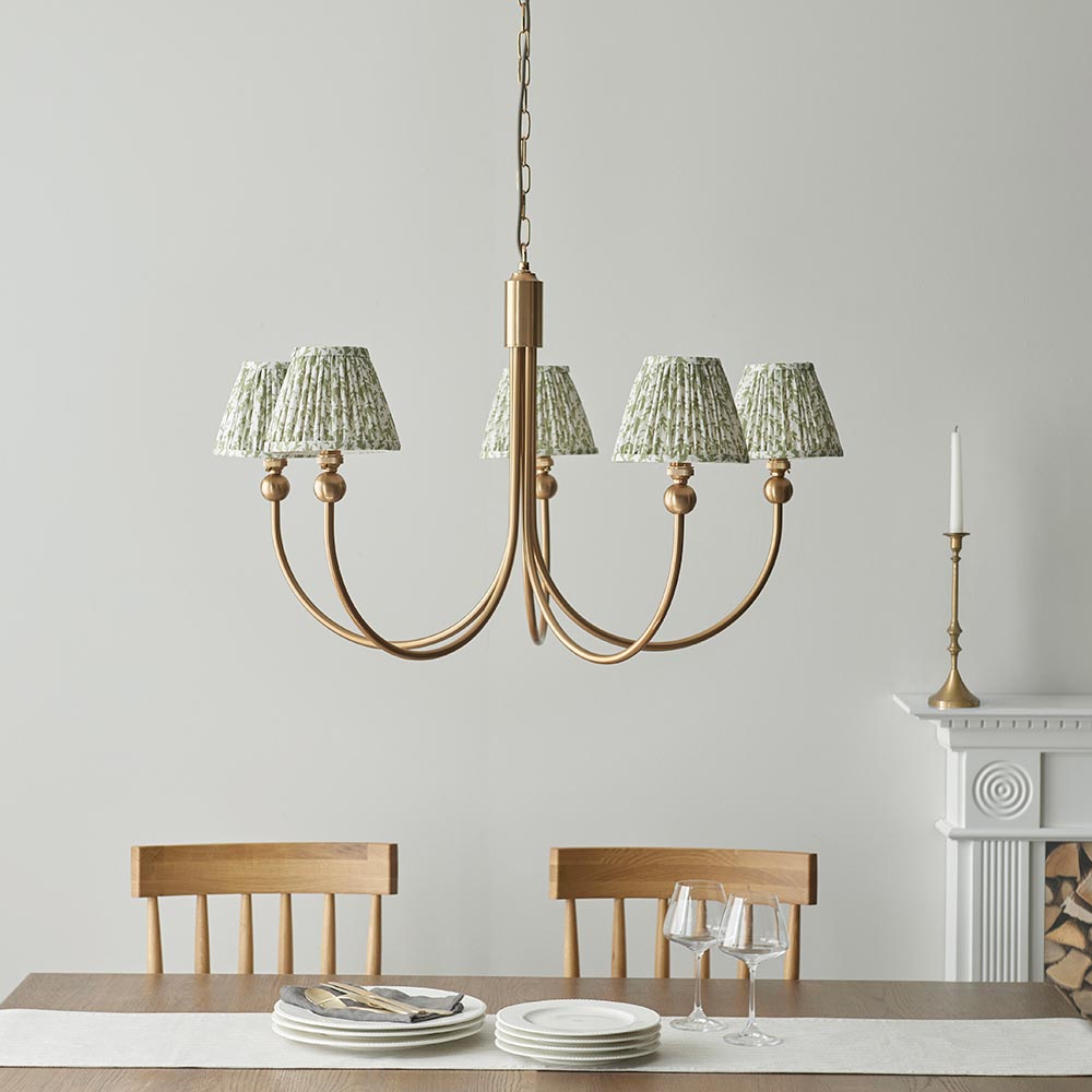 Inspired by classic designs from the past with a fresh new makeover. An elegant 5 light curved arm classic pendant, finished in brushed aged brass, suspended from height adjustable 1.5m chain with grey braided fabric flex and featuring B22 lamp holders for an authentic feel. Finished with 5 of our subtle herb green 16cm Leaf shades to complete the look.