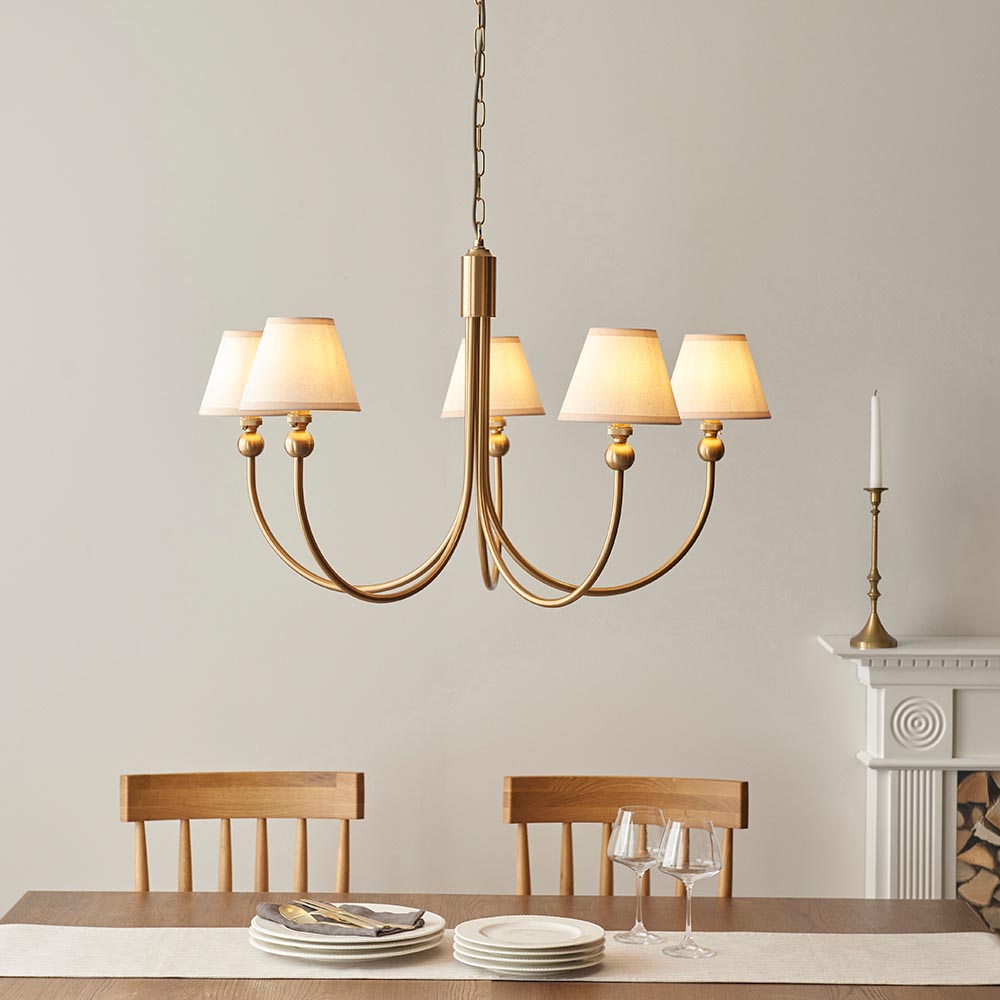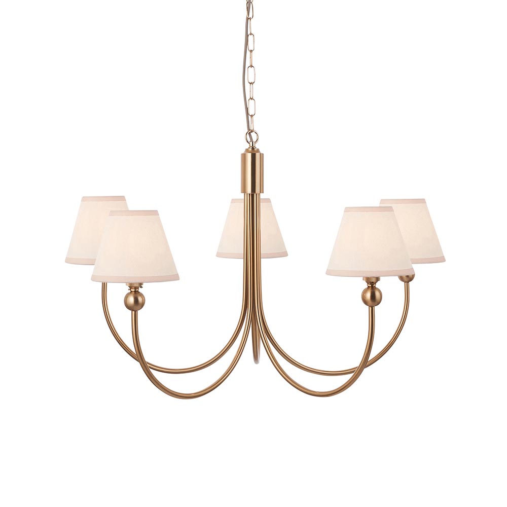Inspired by classic designs from the past with a fresh new makeover. An elegant 5 light curved arm classic pendant, finished in brushed aged brass, suspended from height adjustable 1.5m chain with grey braided fabric flex and featuring B22 lamp holders for an authentic feel. Finished with 5 of our vintage & almond white 16cm Ivy shades to complete the look.