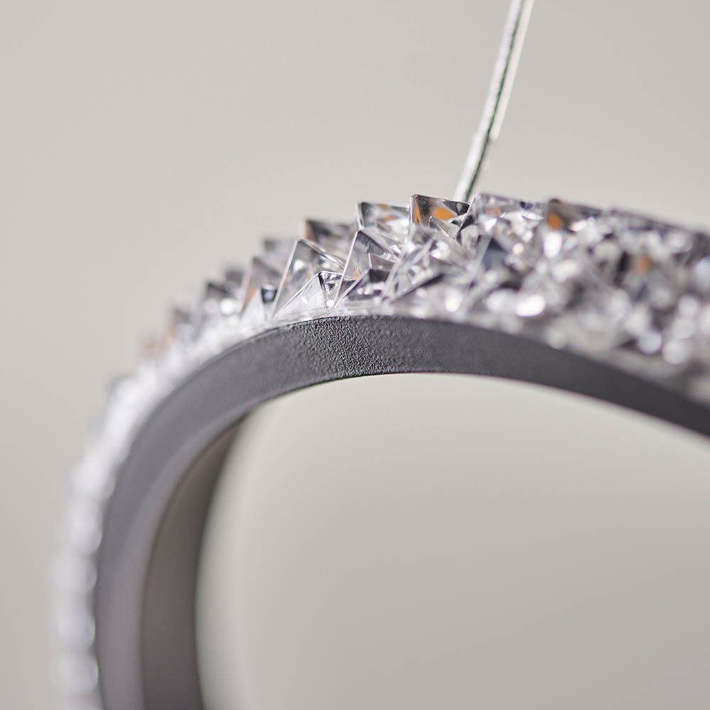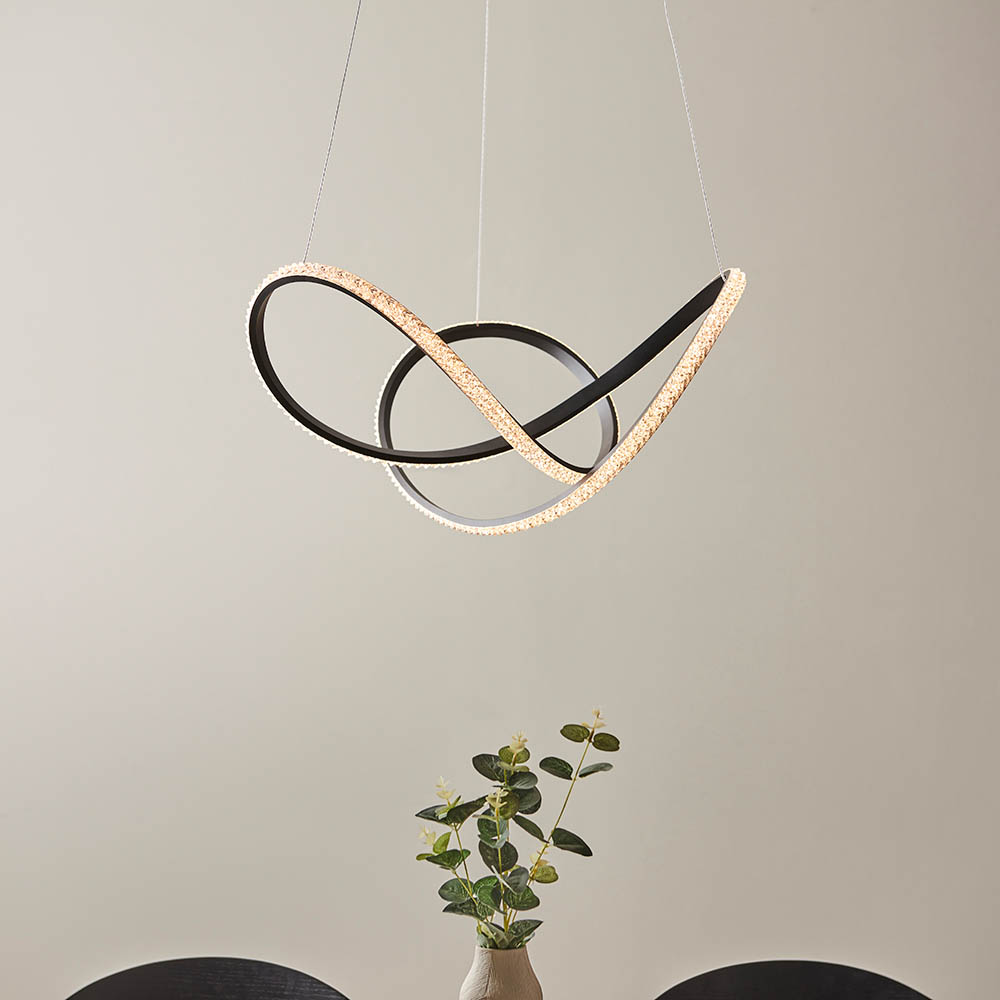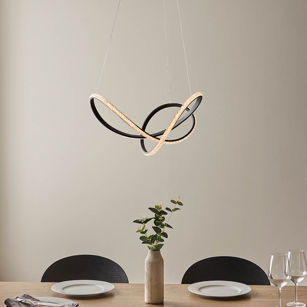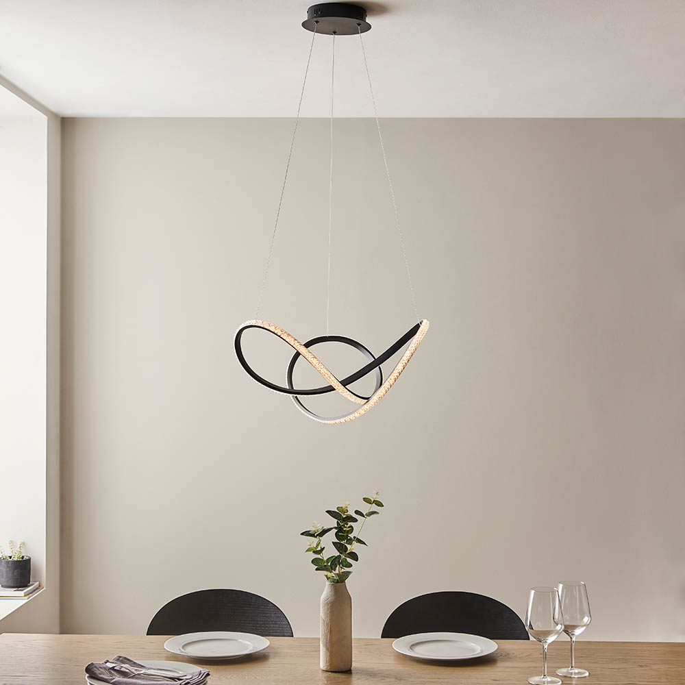 Contemporary elegance is optimised in matt black curves embellished with clear faceted detail - hang this LED pendant above a dining table, or living room to create a sophisticated focal piece.