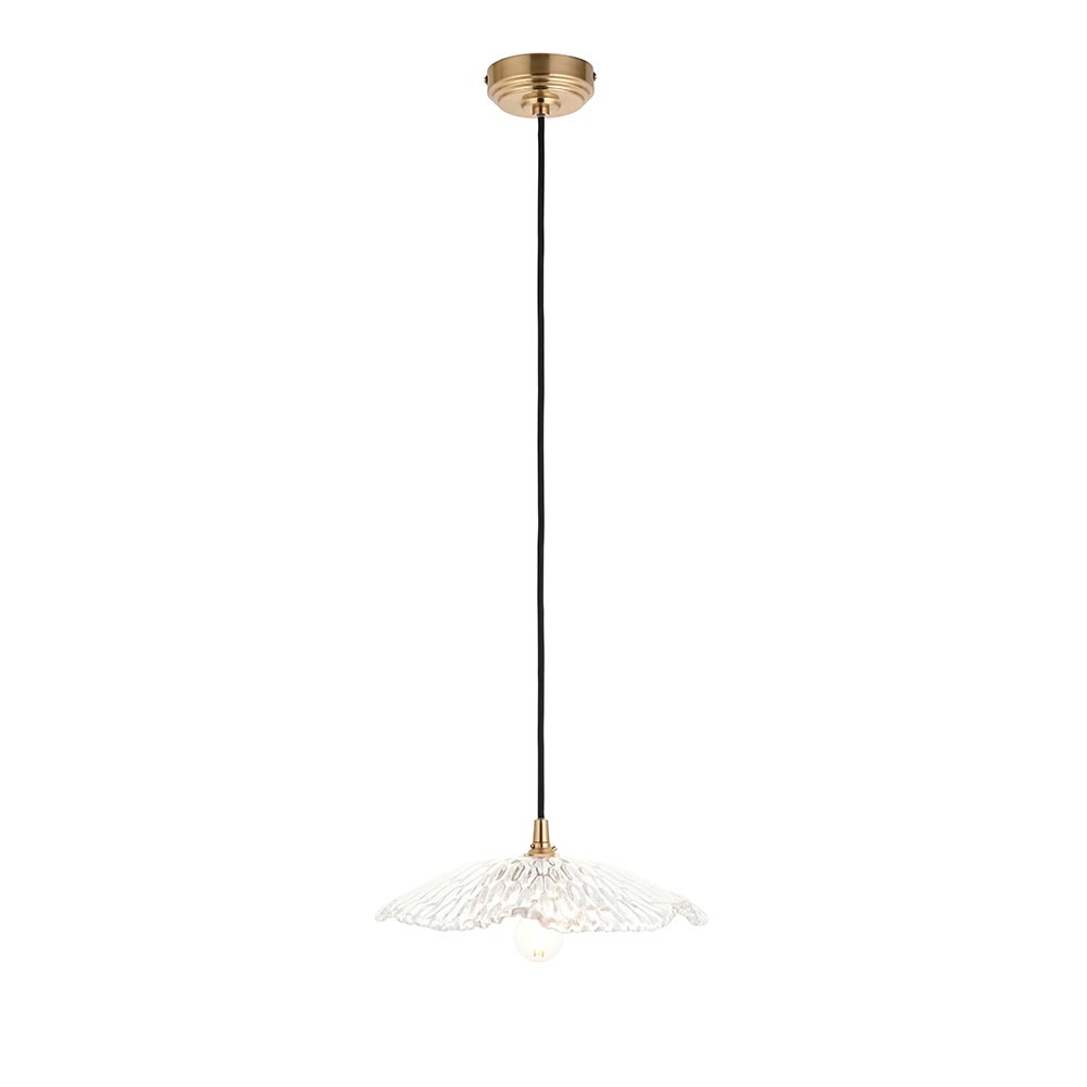 Delicately sculpted with a rippled, shell-like texture, this decorative heavy clear glass shade brings a touch of French-inspired elegance to any setting. Its organic silhouette and artisan-crafted clarity offer a classic decorative feel while diffusing light with soft brilliance. Suspended from a classically styled black braided fabric flex set with warm brass details, adding vintage sophistication to any room. Ideal for kitchens, hallways, or bedrooms.