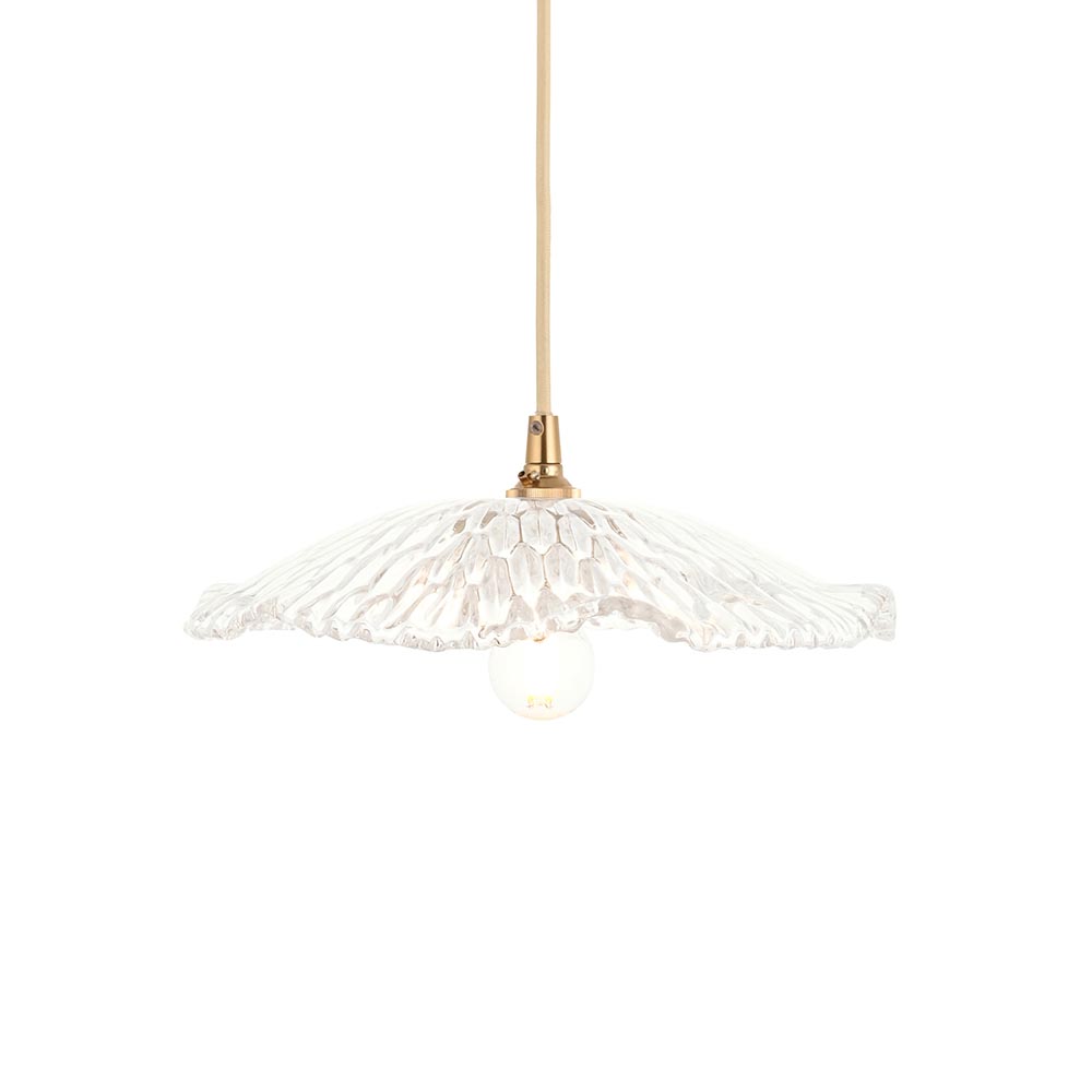 Delicately sculpted with a rippled, shell-like texture, this decorative heavy clear glass shade brings a touch of French-inspired elegance to any setting. Its organic silhouette and artisan-crafted clarity offer a classic decorative feel while diffusing light with soft brilliance. Suspended from a classically styled parchment braided fabric flex set with warm brass details, adding vintage sophistication to any room. Ideal for kitchens, hallways, or bedrooms.