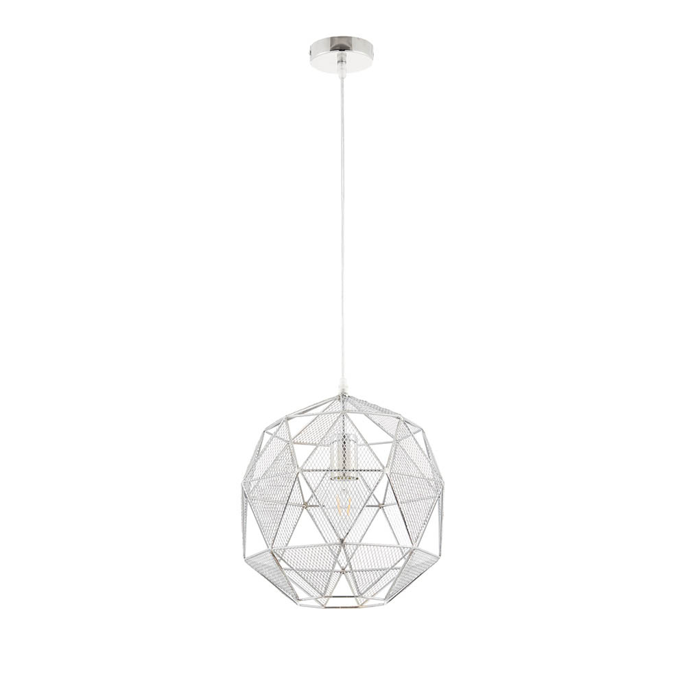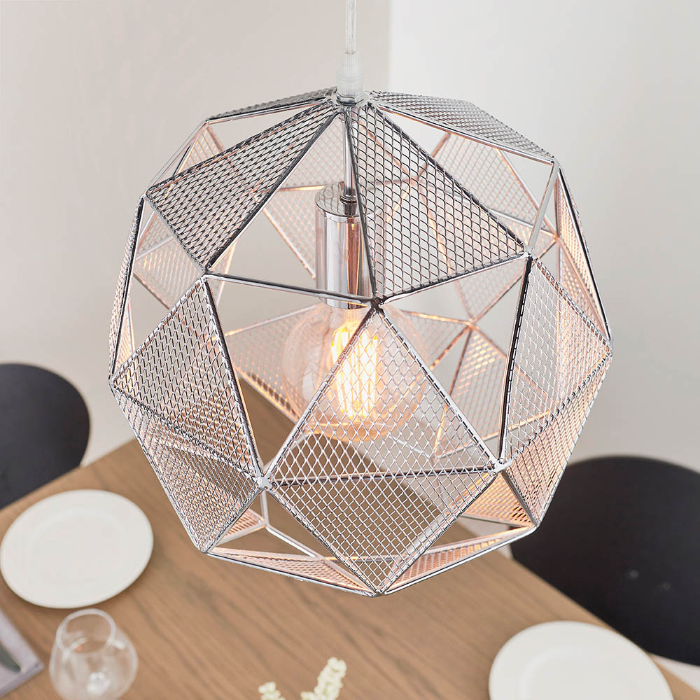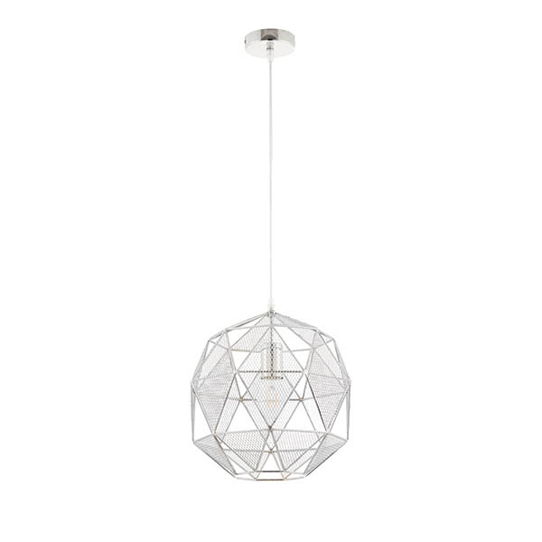 The Armour pendant is on trend with its geometric, angular design and chrome effect finish. Formed from a collection of mesh triangles, the cut outs create a fabulous light effect. Dimmable and compatible with LED lamps. Also available in a copper plate.