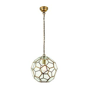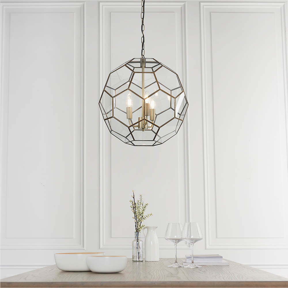 The Miele 3 light pendant has a striking design, incorporating hexagonal glass panels edged in antique brass. Suspended from a decorative chain, dimmable and suitable for use with LED lamps.