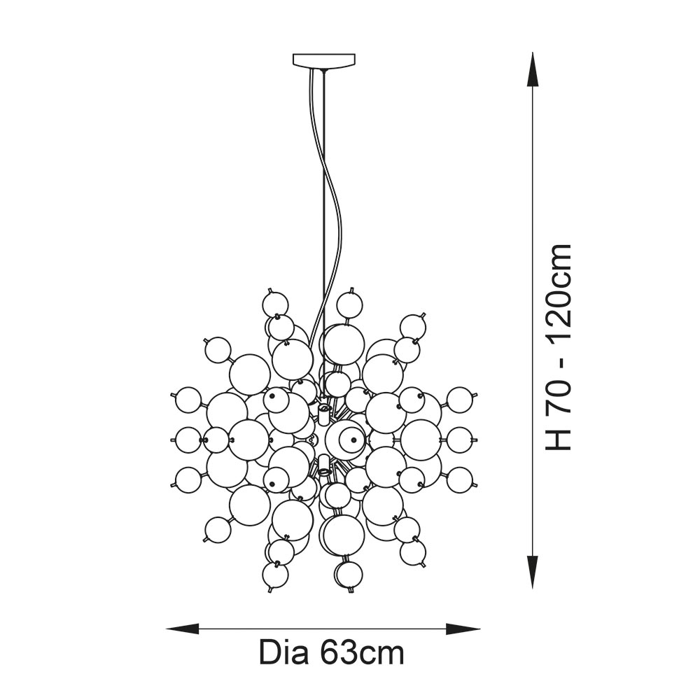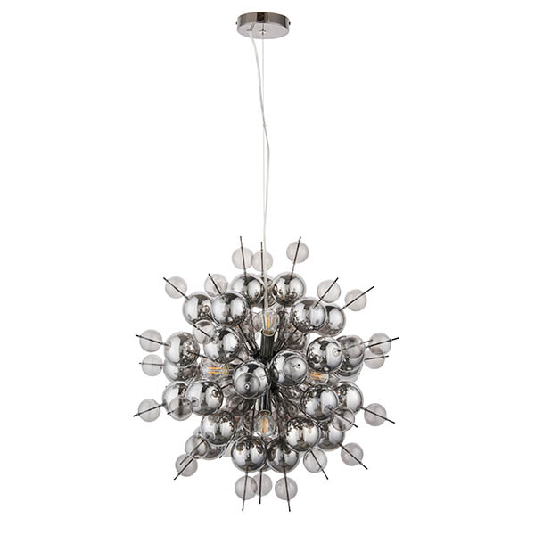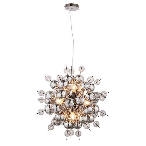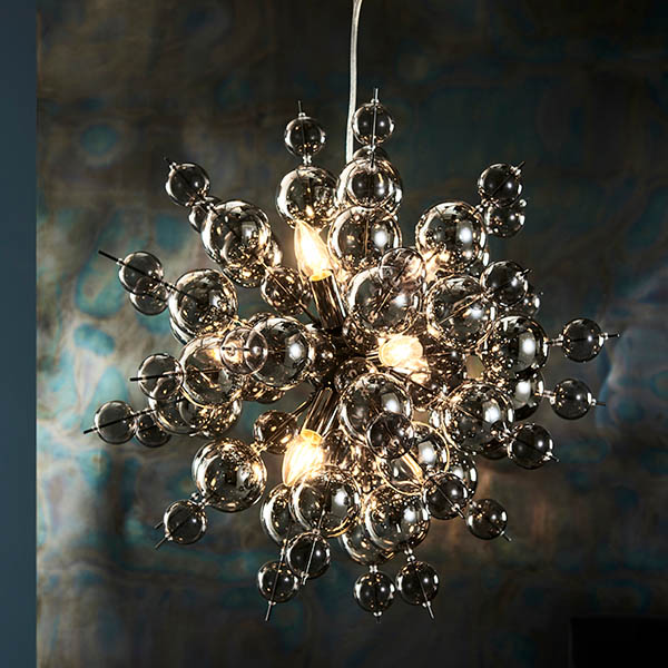 Make a dramatic statement with this spectacular, mirror bomb light fitting embellished with glossy smoked glass and metallic plated balls. This stunning, nine-light pendant features an explosion of shiny glass spheres, creating an atmospheric glow and striking shadow patterns.