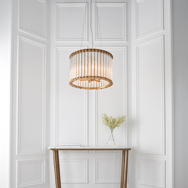 This stunning ceiling pendant consists of a six-armed chandelier enrobed by columns of delicately twisted clear glass. The matt gold finish provides a striking contrast to the clear glass, through which the light shimmers seductively.