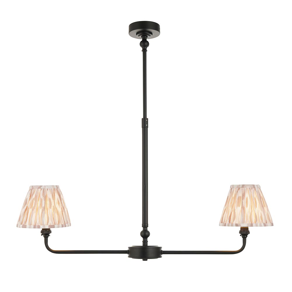 This elegant 2 light pendant is finished in matt black and features our natural 16cm Ikat shade for the perfect timeless style. Its linear shape makes it perfect for positioning over dining tables and comes complete with a height adjustable telescopic stem and B22 lamp holders for an authentic classic look. Matching items available.