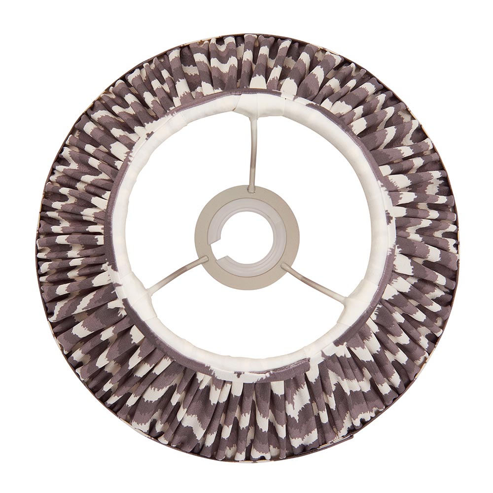 25cm tapered shade with white gimbal. Zigzag pattern in pearl grey colour with taped edge detailing and plain inner lining. Perfect when paired with one of our beautifully decorative table lights.