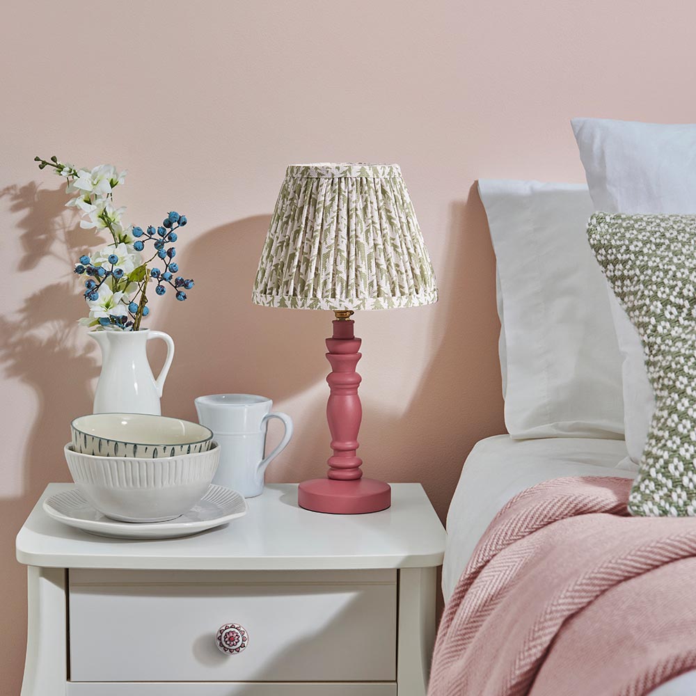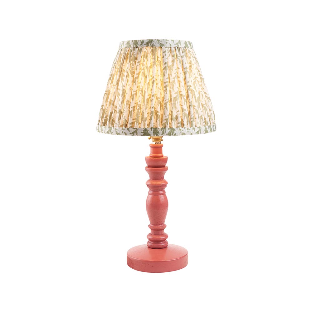 A beautiful wooden turned spindle light, painted satin pink clay. Perfect for classic interiors, featuring a brass B22 switched lamp holder and grey braided fabric flex. Paired with our subtle herb green 20cm Leaf shade for a unique, classic look.