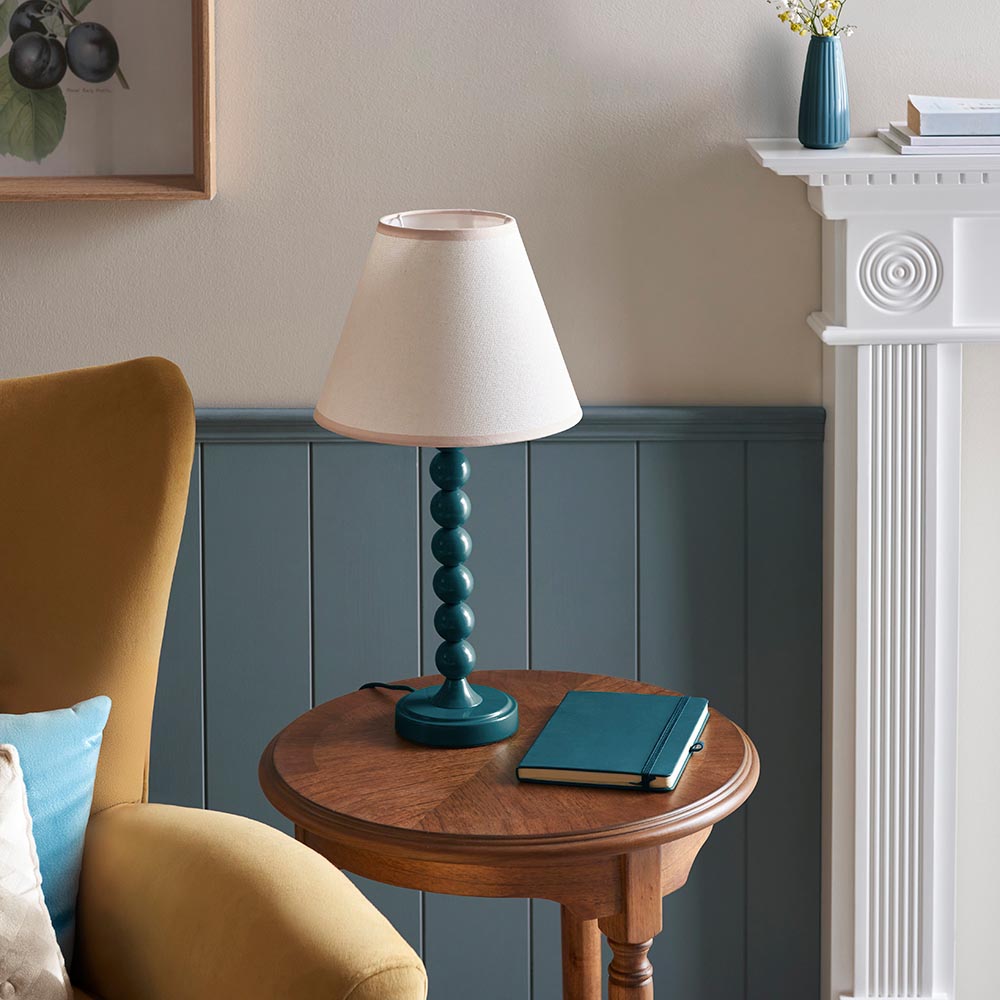 Add some colour to your home with this playful table light. Multiple stacked metal spheres finished in gloss marlin blue paint with an E14 lamp holder, in-line on/off switch and colour matched fabric flex. Paired with our vintage & almond white 25cm Ivy shade to complete this perfect colour addition to your home.