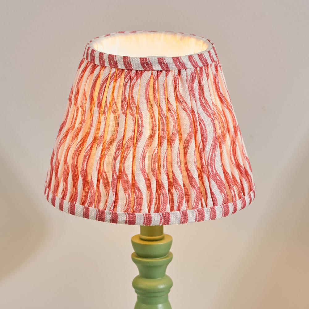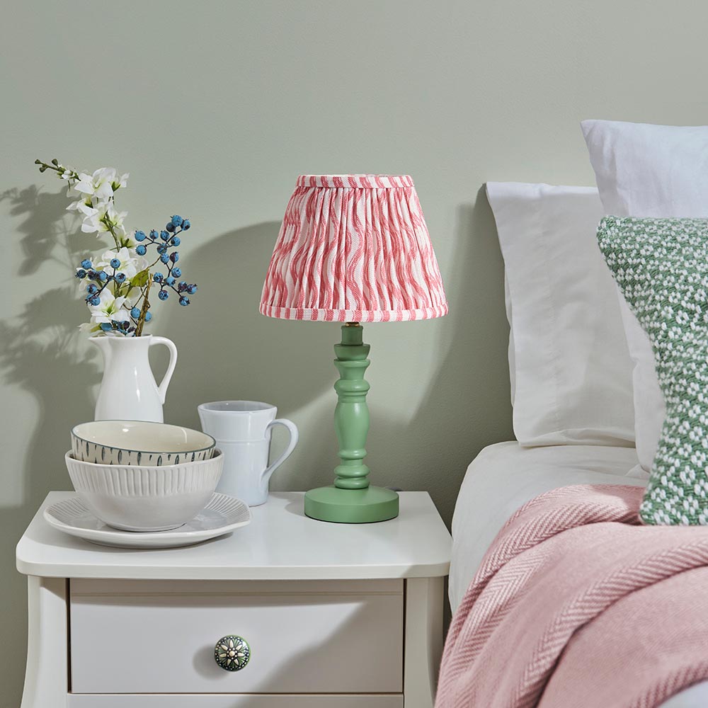 A beautiful wooden turned spindle light, painted satin Cotswold green. Perfect for classic interiors, featuring a brass B22 switched lamp holder and grey braided fabric flex. Paired with our bright coral pink 20cm Ripple shade for a unique, classic look.