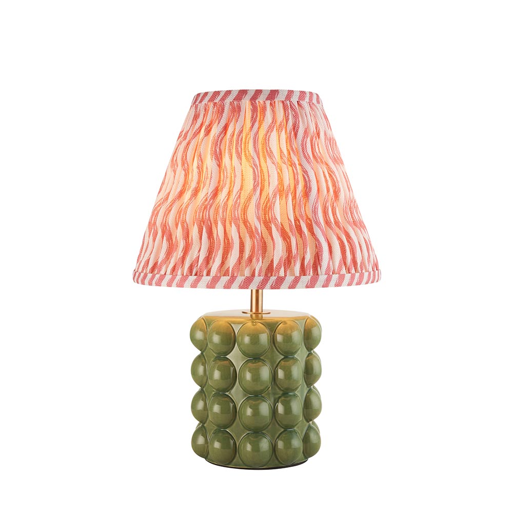 This playful ceramic base features sculptured bobble shapes finished in a gloss olive green glaze. With a switched brass B22 lamp holder and grey braided flex, paired with our bright coral pink 25cm Ripple shade.