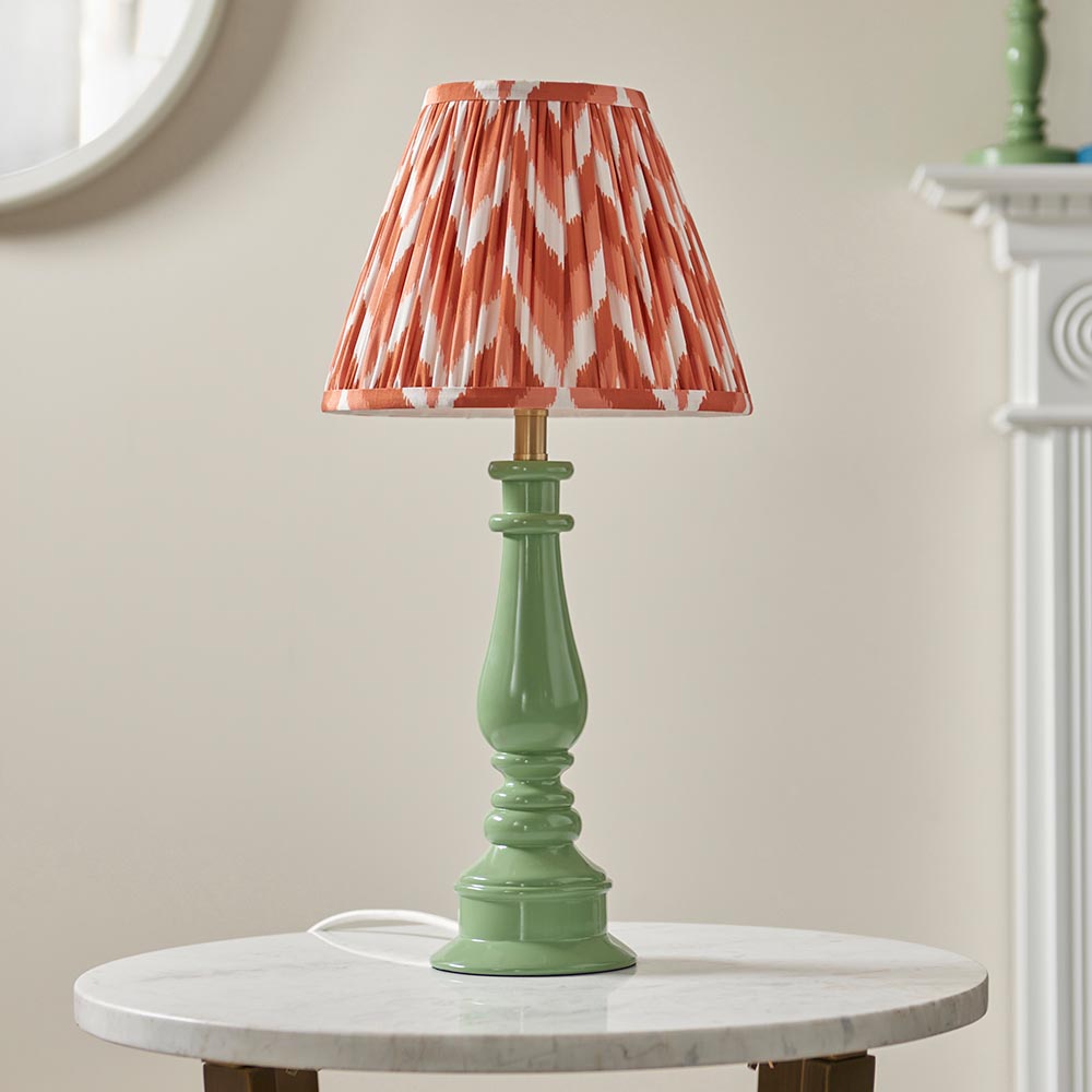 Getting its inspiration from turned classic staircase spindles, this table light is finished in high gloss Cotswold green colour resin, with switched B22 brass lamp holder and pale braided fabric flex. Paired with our bright apricot orange 25cm Zigzag shade to complete this timeless country luxe look.
