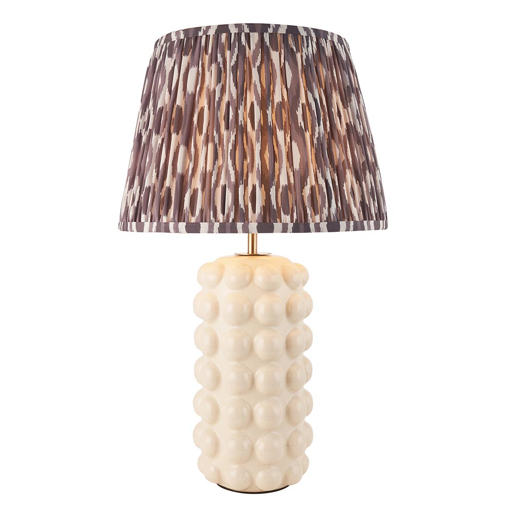 An interior must have, this playful ceramic table light features sculptured bobble shapes finished in a gloss vintage white crackle glaze. With a switched brass B22 lamp holder and grey braided flex; paired with our stylish pearl grey 35cm Ikat shade for the perfect interior addition.