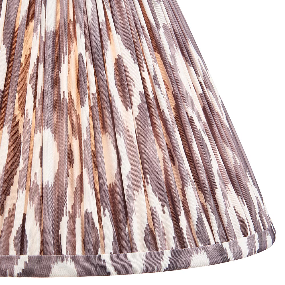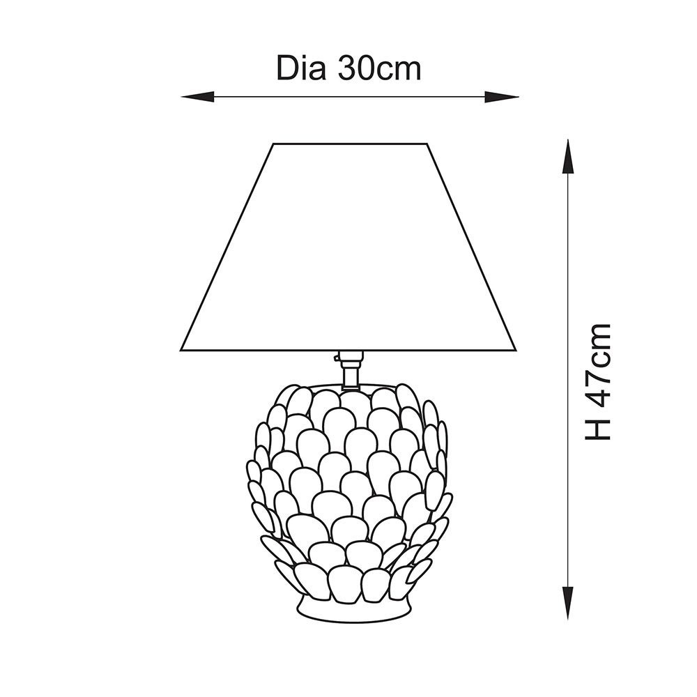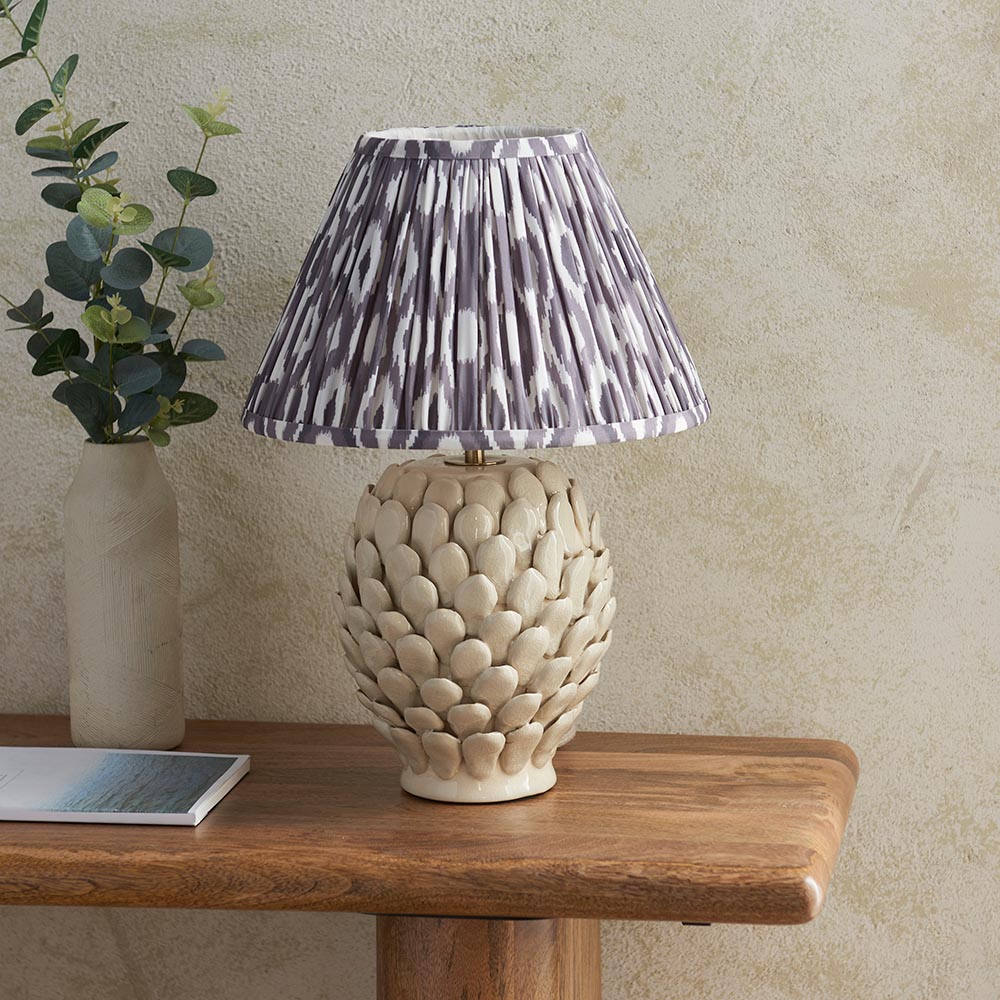 A beautifully organic shaped ceramic table light, decorated with handmade leaf shaped details and brushed aged brass switched B22 lamp holder. Paired with our stylish pearl grey 30cm Ikat shade to complete the look.