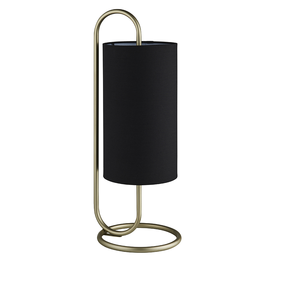 Floating cylinder black fabric shade encapsulated by the soft curves of antique brass painted metal work. A table light perfect for today's contemporary living; other finishes also available.