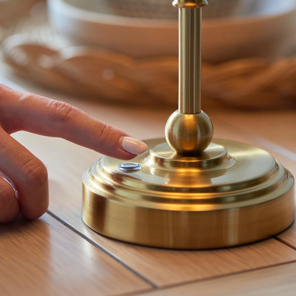 Not tied down by the need for a power cable, this portable, rechargeable 3 stage touch dimmer table lamp enables you to select your own level of light. Classic in style and finished in aged brass making it easy to place around your home. Turn on for low light then touch controlled to increase light level to medium then bright, making it the perfect bedside light. Taking just 5.5 hours to fully charge and giving up to 36 hours of continuous light. Place on shelving, hallways, bedsides or dining tables, a truly versatile addition to your home. Paired with our vibrant marlin blue 16cm Ripple clip-on shade for the perfect timeless style.