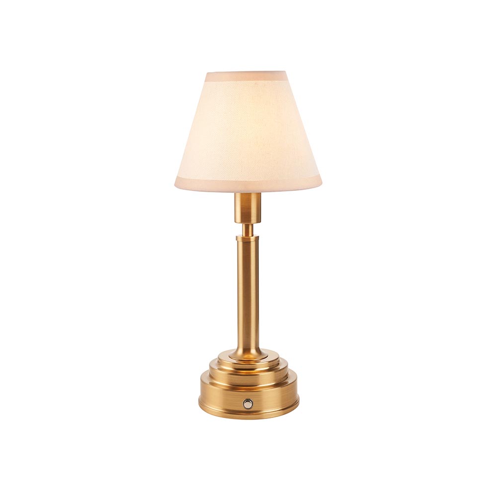Not tied down by the need for a power cable, this portable, rechargeable 3 stage touch dimmer table lamp enables you to select your own level of light. Classic in style with stepped base and finished in aged brass making it easy to place around your home. Turns on for low light then touch controlled to increase light level to medium then bright, making it the perfect bedside light. Taking just 5.5 hours to fully charge and giving up to 36 hours of continuous light. Paired with our vintage & almond white 16cm Ikat shade for the perfect timeless style.