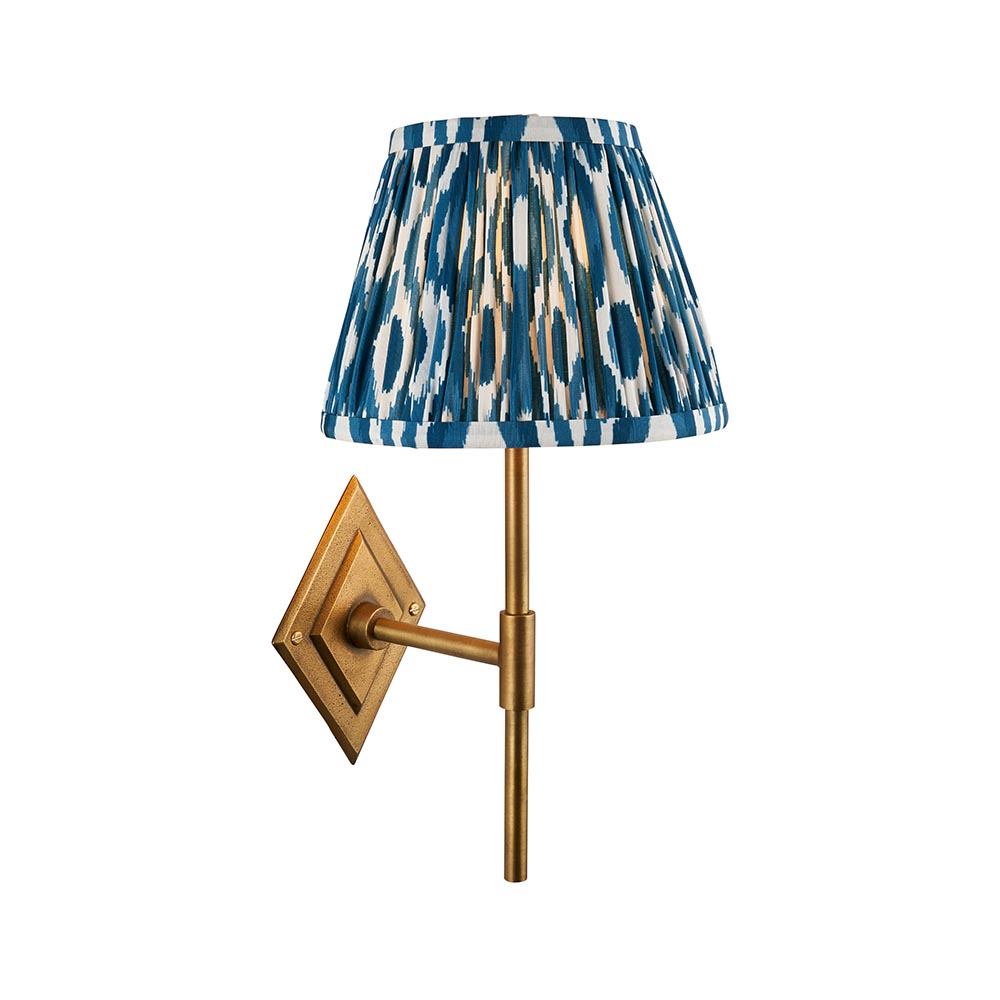 Bold yet refined, this single B22 wall light combines artisan craftsmanship with vibrant character. Its sand-cast decorative wall plate features a stepped diamond design, bringing textural interest and timeless appeal. Paired with a tapered pleated fabric shade in a lively marlin blue Ikat pattern, it adds a pop of colour and a soft, inviting glow—perfect for hallways, bedside settings, or eclectic interiors seeking a touch of handcrafted elegance.