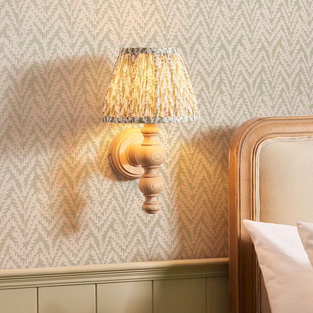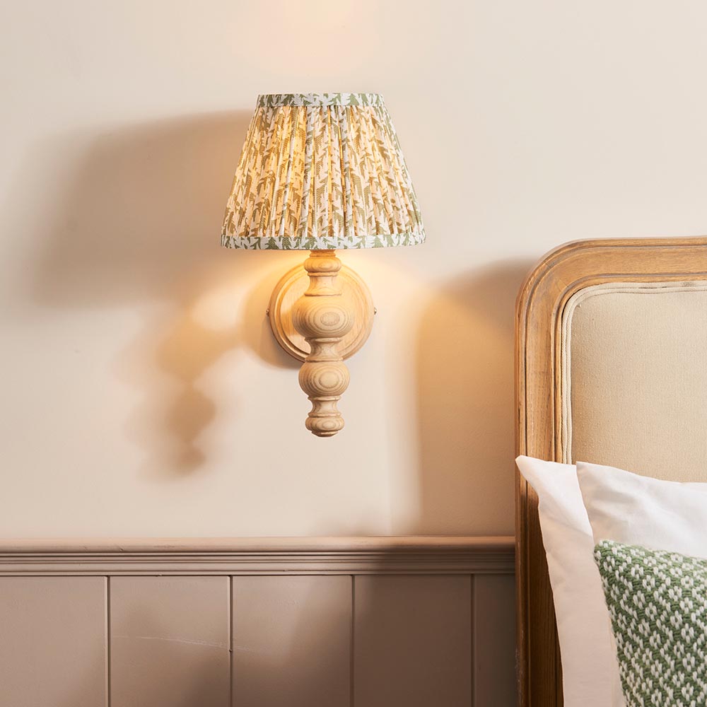 Beautiful natural Ash wooden turned spindle wall light, perfect for classic interiors, featuring a brass B22 lamp holder. Finished with our herb green bay 20cm Leaf shade for a unique, classic look.