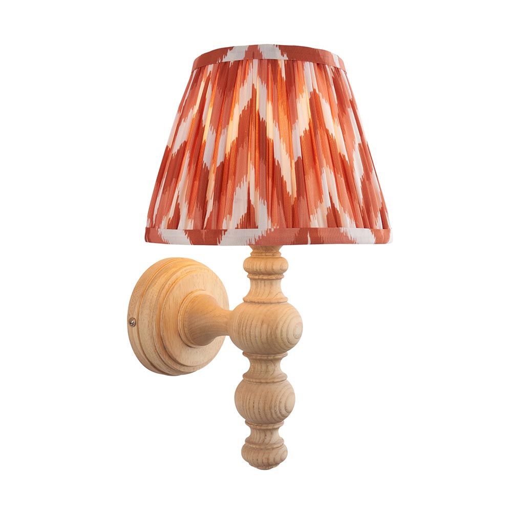 Beautiful natural Ash wooden turned spindle wall light, perfect for classic interiors, featuring a brass B22 lamp holder. Finished with our bright apricot orange 20cm Zigzag shade for a unique, classic look.