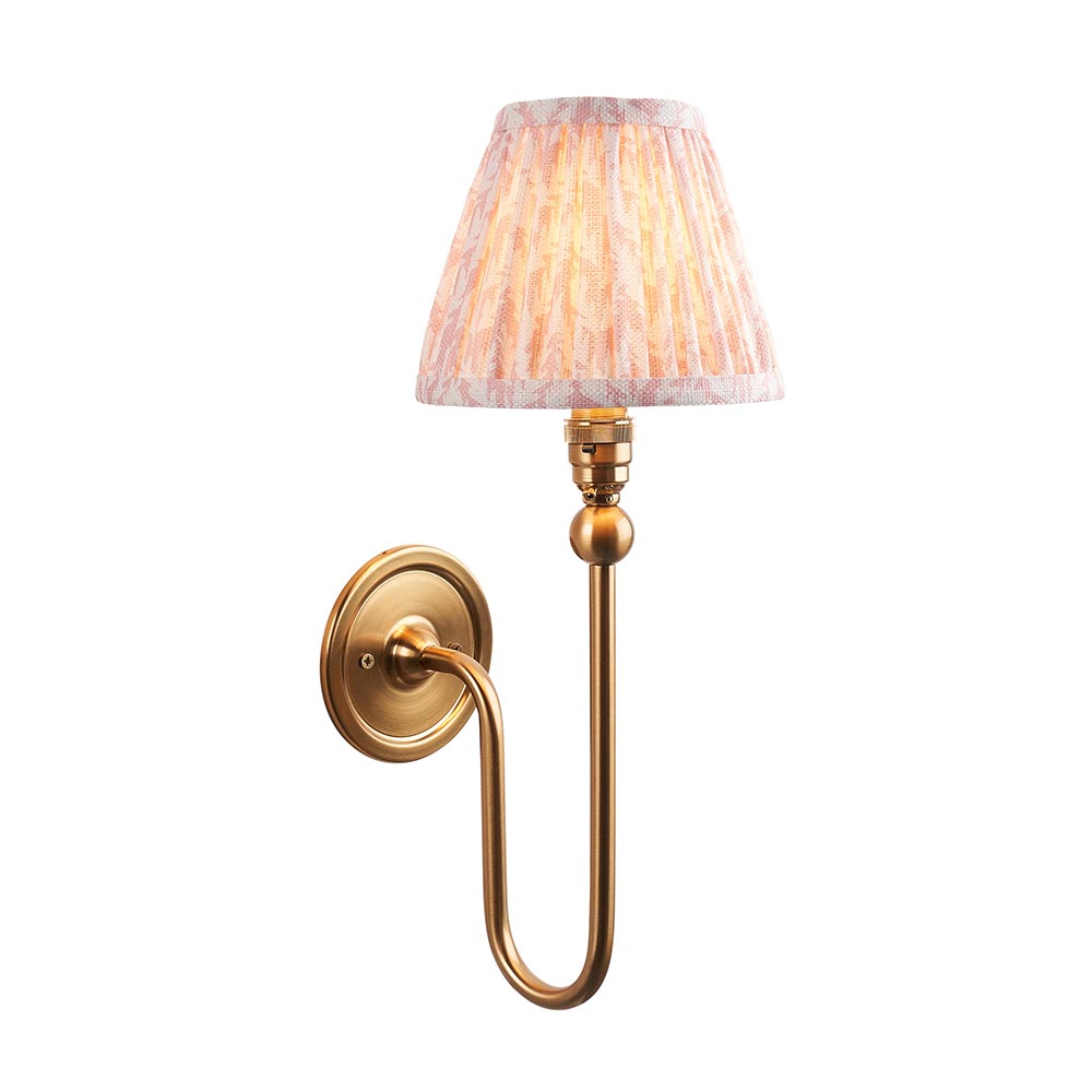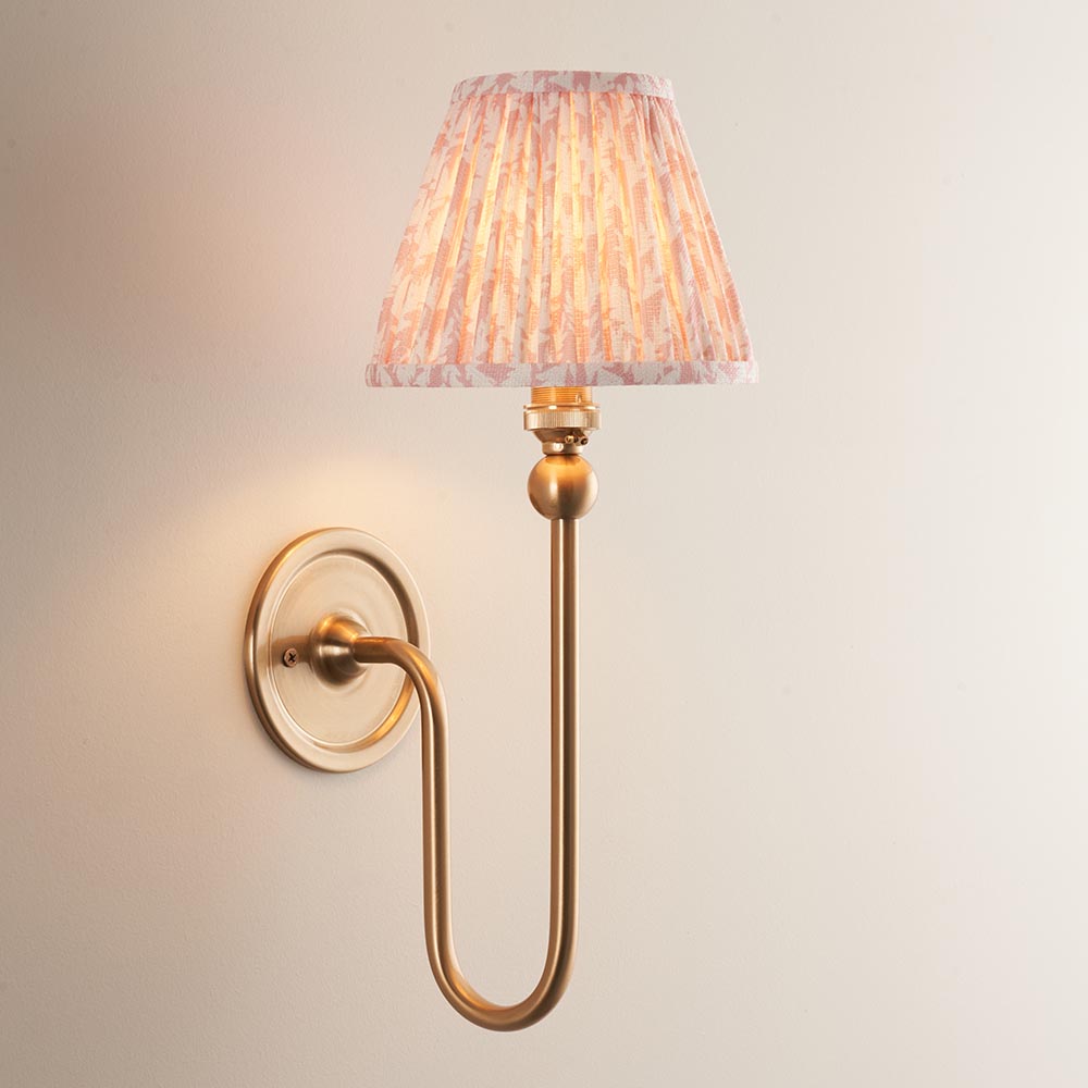 An elegant long line wall light with authentic B22 lamp holder and classic flat wall back, finished in brushed aged brass. Combined with a subtle peachy keen leaf 16cm fabric shade.