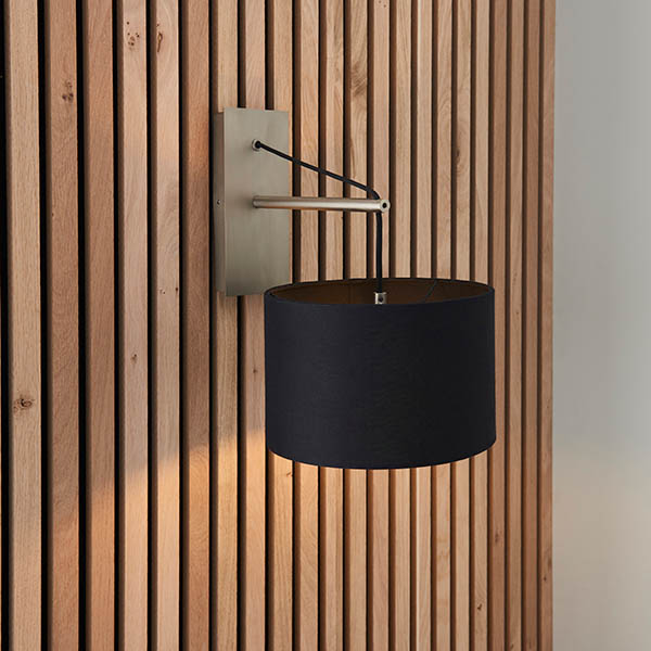 This cantilevered wall light is inspired by architectural forms and brings instant contemporary style and a refined aesthetic. The black cotton shade is suspended from a choice of matt brass or matt nickel metalwork with a matt black base adding modern design symmetry. Combine with the table and floor light from the same range for a coordinated look.