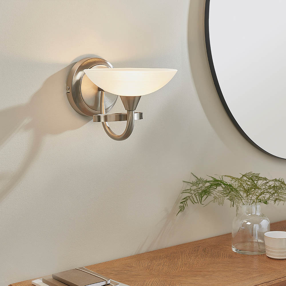 The Cagney wall light is finished in satin chrome effect with white painted glass shades with faint line detailing. suitable for use with LED lamps and dimmable; ceiling options and antique brass finish also available